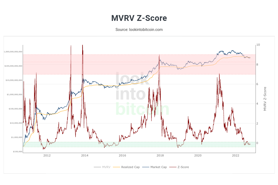 MVRV Z-score is an important and widely used metric for Bitcoin. It shows the extremes of Bitcoin price moving above or below its realized price. Realized price is the average cost basis of all bitcoins purchased. So it can be thought of as an approximate break-even level for the market. Price only ever dips below that level in extreme bear market conditions.