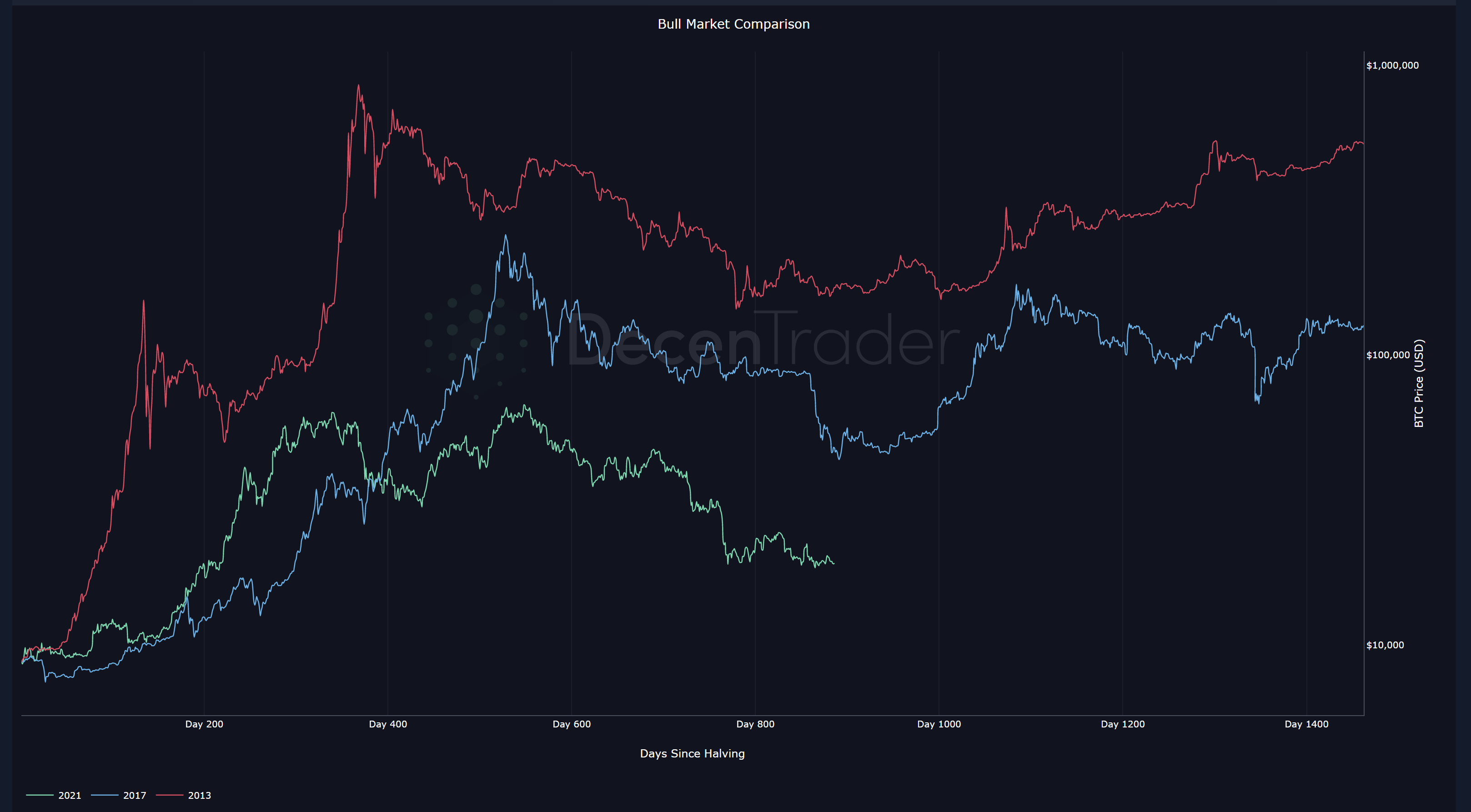 In terms of silver linings, I have a couple! First, we are actually a fair way through the market cycle, and likely through the majority of this bear market already. The chart below shows Bitcoin performance each cycle since the halvening, and we are already around the capitulation points of the previous two cycles.