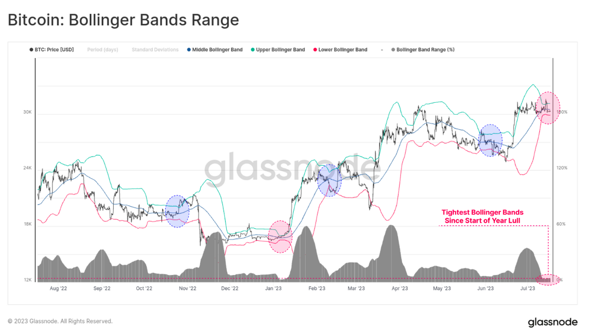 In the latest edition of its weekly newsletter, “The Week On-Chain,” analytics firm Glassnode revealed the tightest Bollinger Bands since the start of 2023.