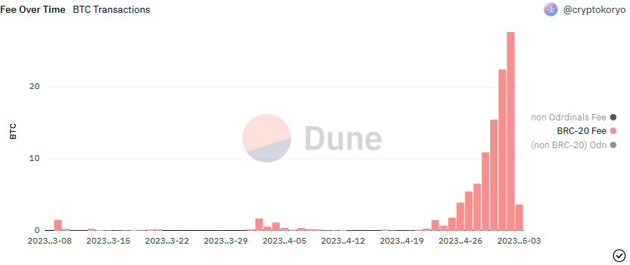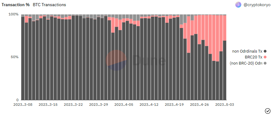 The BRC-20 token frenzy has also dwarfed the blockchain’s original number of Bitcoin transactions. The number of BRC-20 transactions on the Bitcoin blockchain between April 29 and May 2 reached over 50%, outperforming regular BTC transactions.
