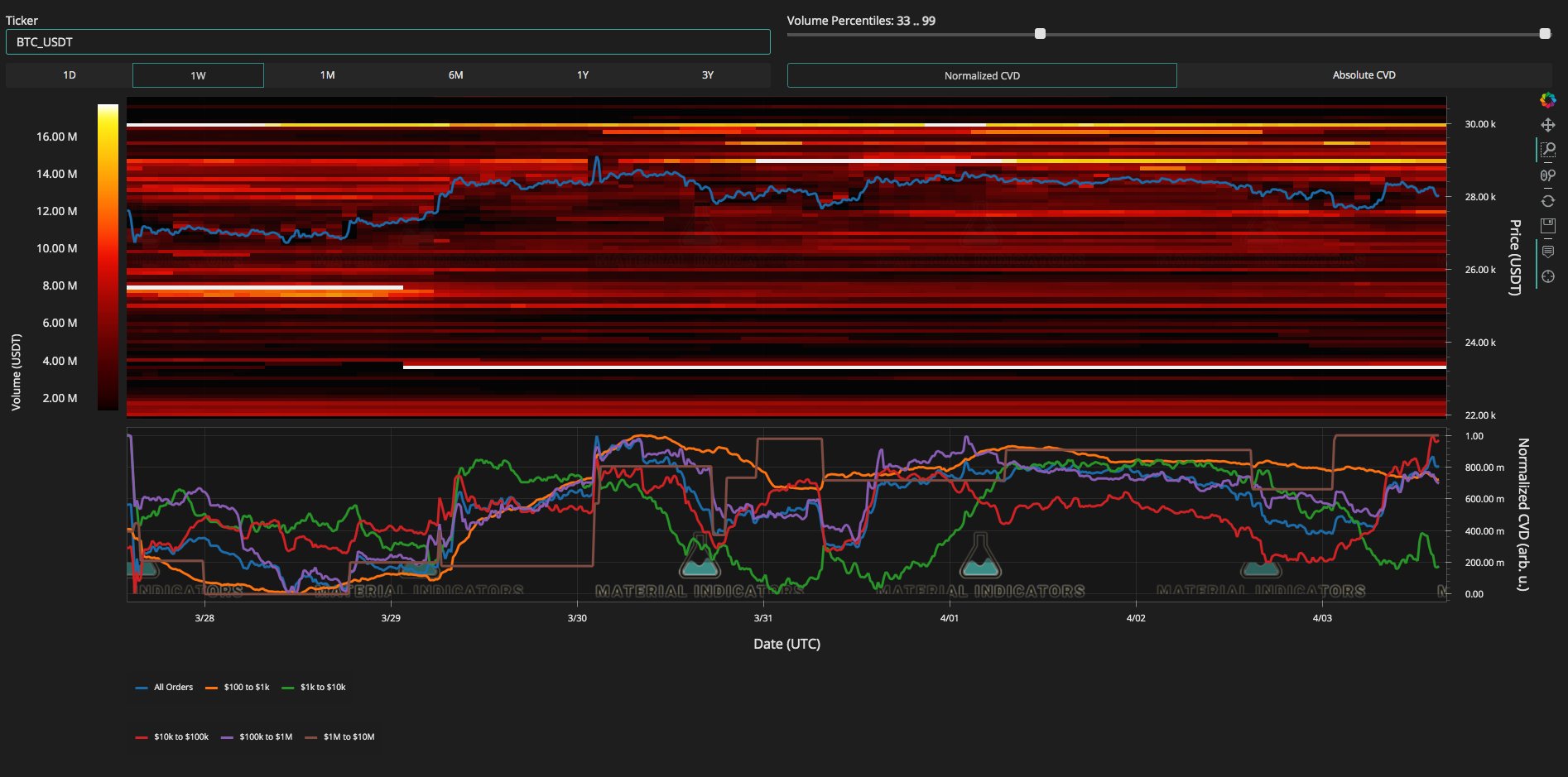 “Range bound,” he summarized, referring to the equilibrium price (EQ) at $28,234 — the midpoint of the upper and lower bounds of the trading range — holding over the weekend.