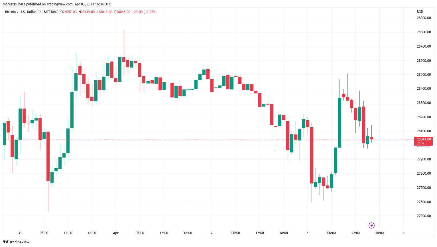 Data from Cointelegraph Markets Pro and TradingView followed BTC/USD as it lingered around $28,000 on Bitstamp.