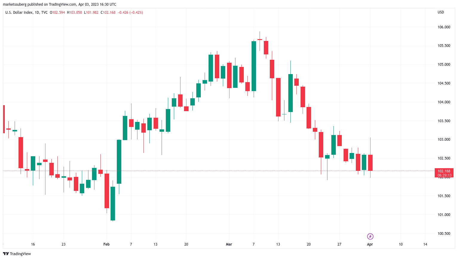 The U.S. dollar index (DXY), having initially benefitted from the Opec+ announcement, continued falling through the day, at one point wicking below 102, almost matching two-month lows.