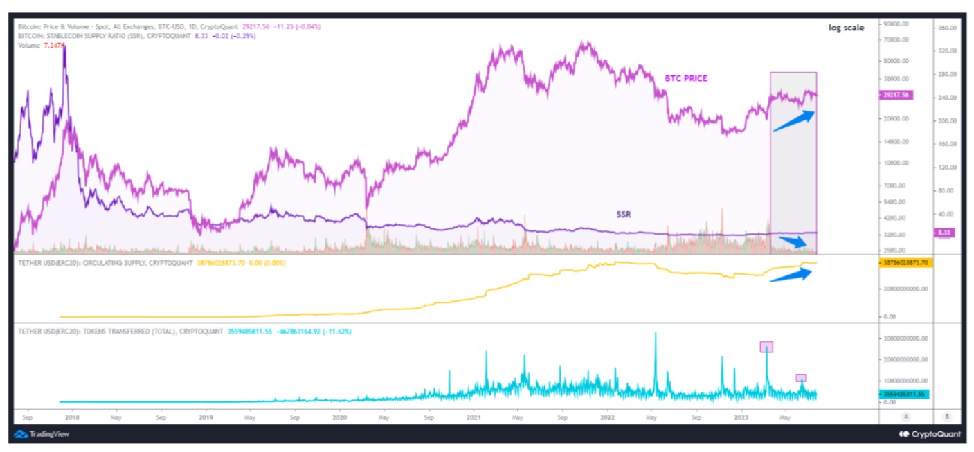 “Since the end of March, we can see in the chart that the trading volume has registered a decrease and SSR a stagnation, while we have an increase in the circulating supply of the stablecoin Tether (the largest stablecoin in terms of volume), followed by an increase of Bitcoin’s price,” she wrote in one of the platform’s Quicktake market updates on July 26.