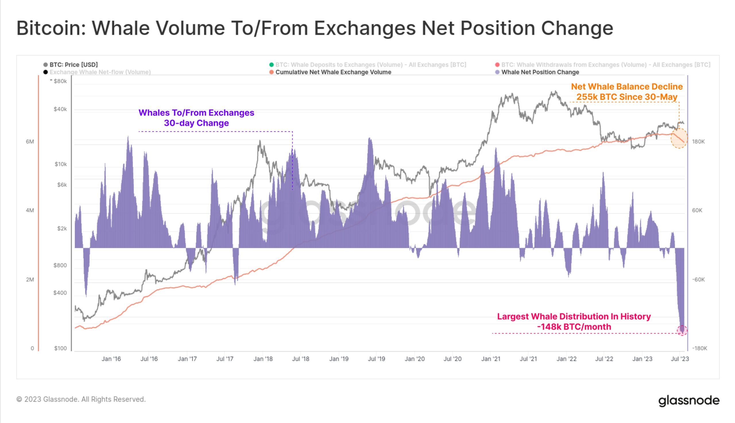 “This is the largest monthly balance decline in history, hitting -148k BTC/month. This indicates that there are noteworthy shifts happening within the Bitcoin Whale cohort worth diving deeper into.“