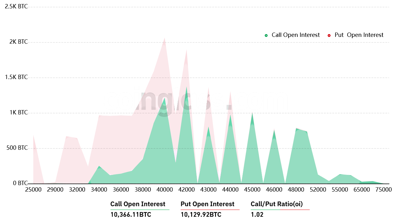 - Between $42,000 and $44,000: 560 calls vs. 150 puts. The net result is $175 million favoring the call (bull) instruments.