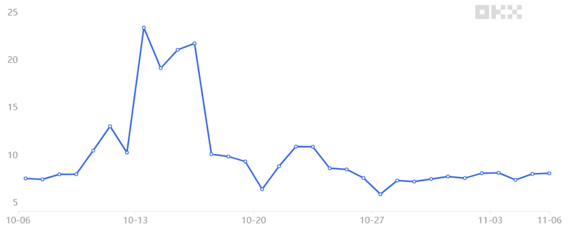 Data shows that OKX traders’ margin lending ratio has remained relatively stable at 8 for the past week. From one side, the indicator is somewhat concerning, giving the rally from $20,050 to $21,475 on Nov. 5, which should have positively impacted the margin lending ratio. The present 8.1 level leaves enough room for sustainable leverage buying pressure when the time comes.