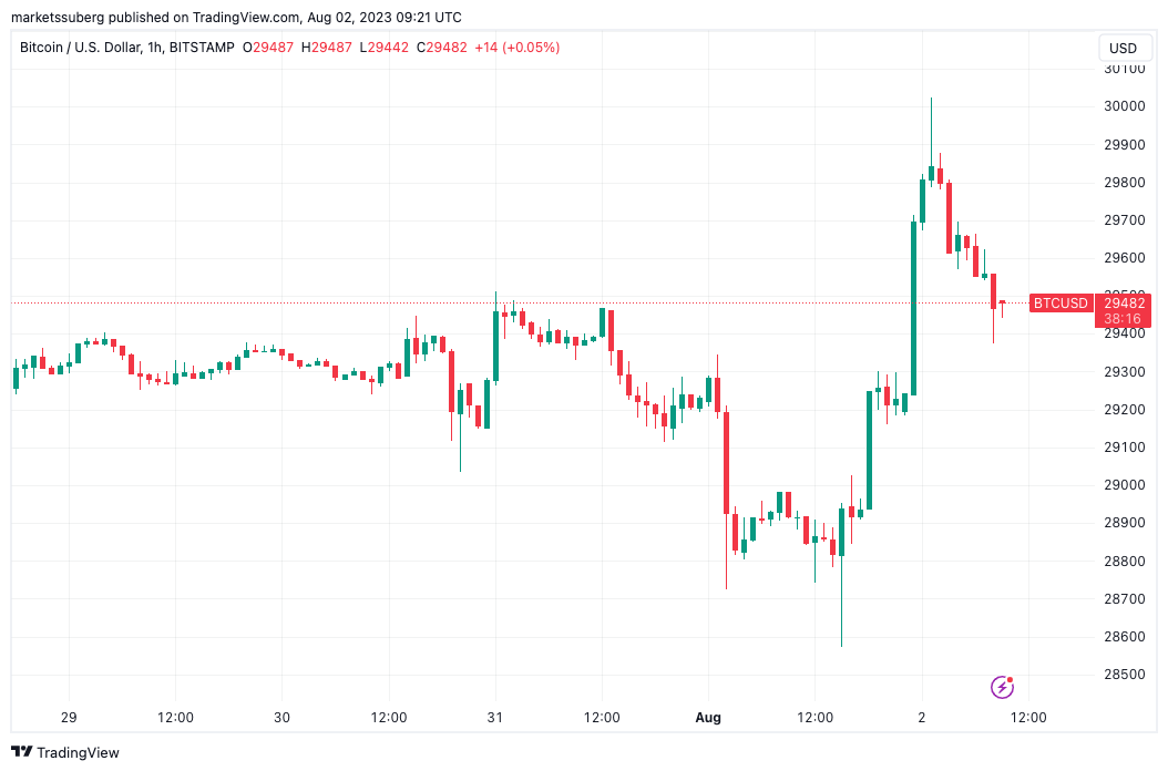 Bitcoin (BTC) spiked above $30,000 on Aug. 2 as a tour of its trading range saw BTC price volatility return.