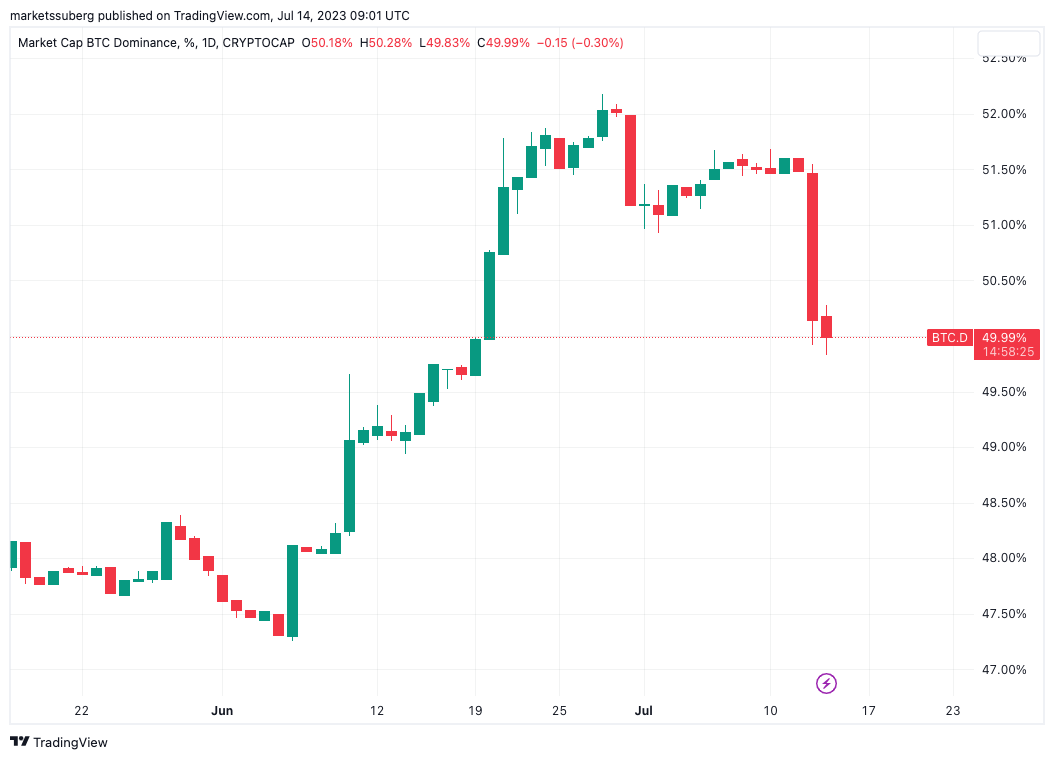 The largest cryptocurrency previously constituted almost 52% of the total, dropping below 50% overnight to near one-month lows.