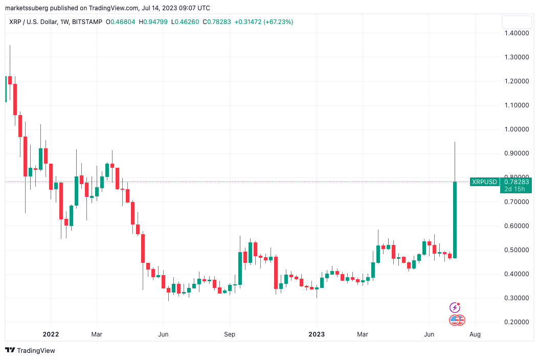 XRP/USD immediately spiked by over 100%, almost touching the $1 mark before returning to trade near $0.80 at the time of writing. The last time that such levels formed part of the chart was in April 2022.