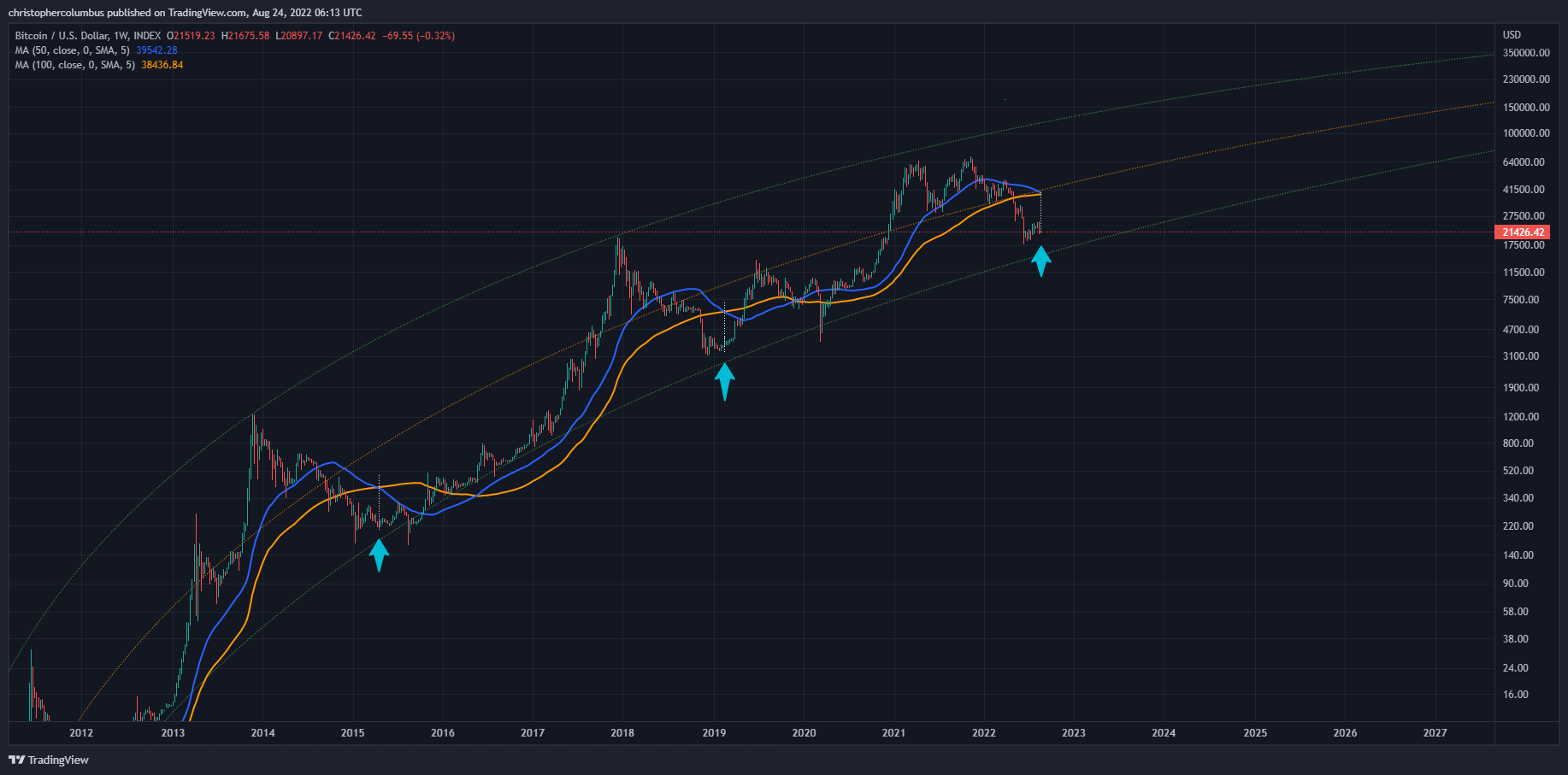 He added that five months prior, the same pair of MAs had correctly assessed the incoming market downtrend which saw BTC/USD hit a macro bottom of $17,600 in June.