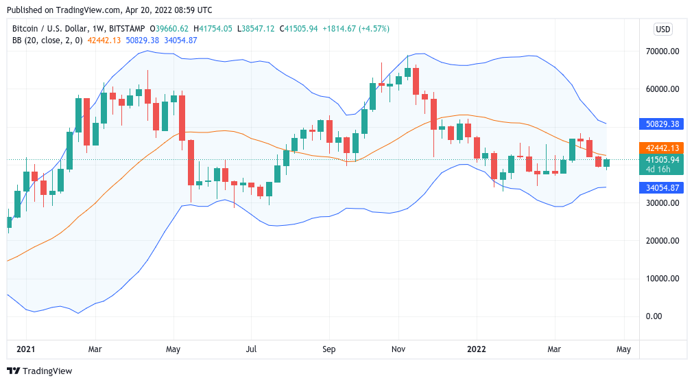 “Bollinger Bands are tightening on price,” he told Twitter followers, referring to the Bollinger Bands volatility indicator on the weekly chart.