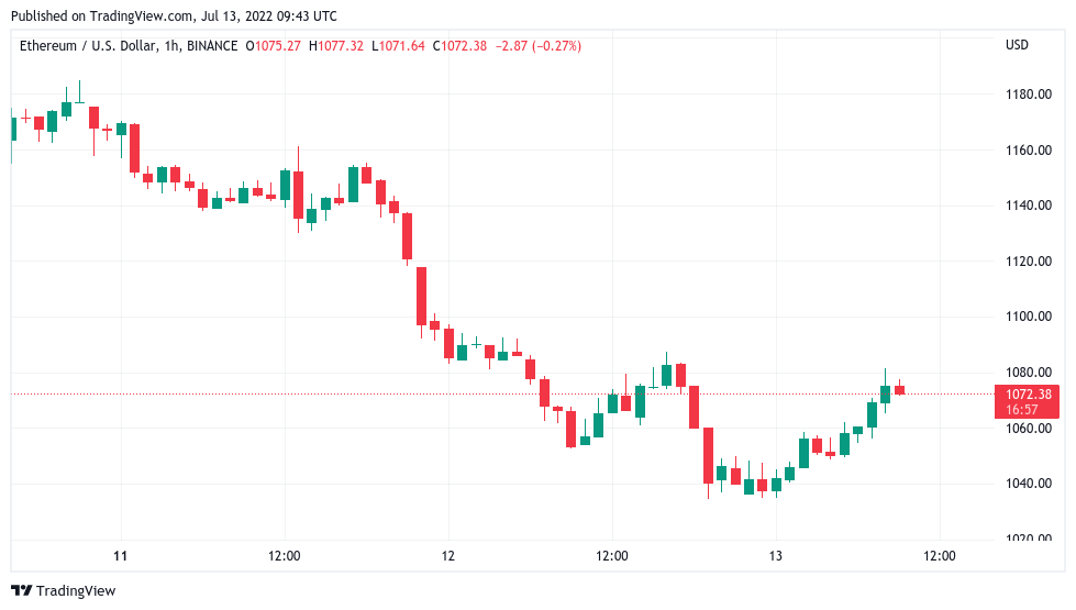 Ether (ETH), after losing 8% the day prior, circled $1,075 at the time of writing, still down 6.3% over the past seven days.