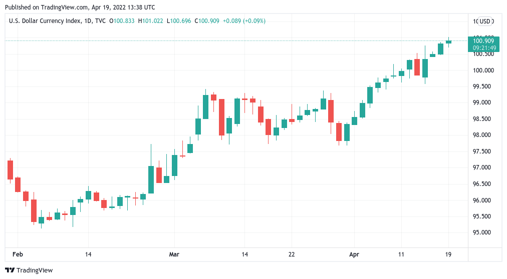The U.S. dollar currency index (DXY) remained above the crucial 100 mark on the day, with analysts previously predicting that its next move would be a make-or-break moment for crypto.