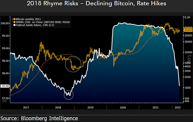 “Long risk assets may be fighting the Fed, among the riskiest — Bitcoin — faces headwinds as rate-hike expectations rise,” he wrote.
