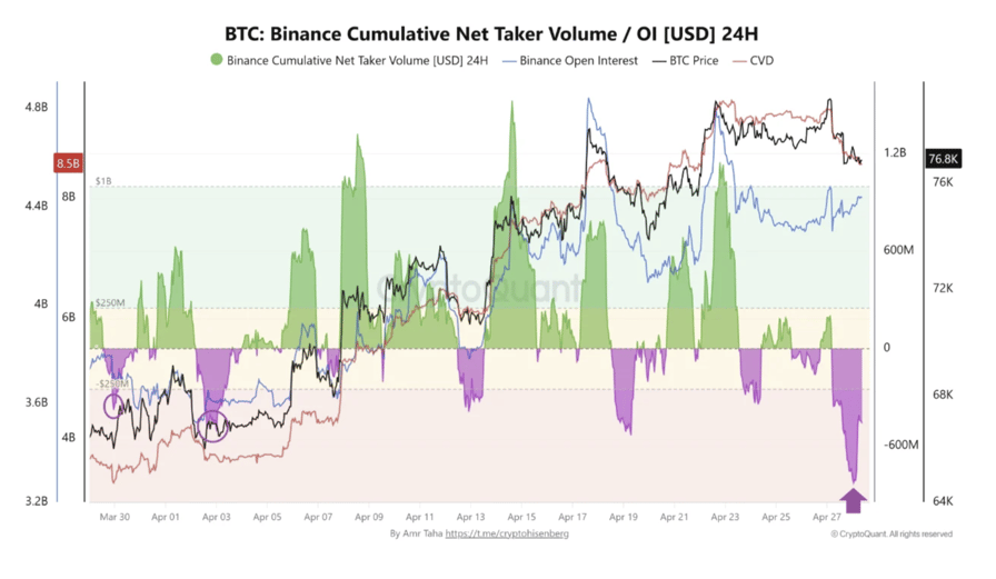 Derivatives data shows strong sell-side activity on Binance. Crypto analyst Amr Taha noted that the 24-hour cumulative net taker volume dropped by $828 million on April 27, the lowest reading since late March.