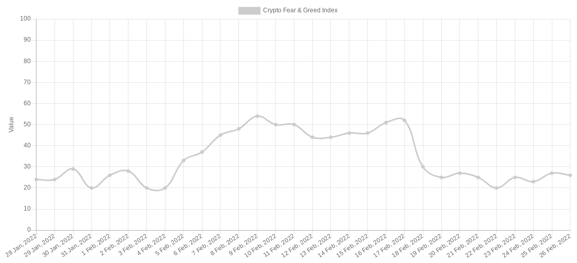 The Crypto Fear & Greed Index, while inching up towards the end of the week, remained in the low “fear” zone at 26/100.