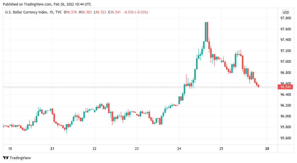 The U.S. dollar, which had surged in strength as hostilities began, gave back most of its gains, with the U.S. dollar currency index (DXY) returning to 96.5 from highs of 97.7.