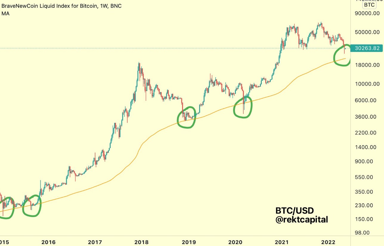 One metric that has historically functioned as a solid level of support for Bitcoin is its 200-week moving average (MA), as shown in the following chart posted by market analyst Rekt Capital.