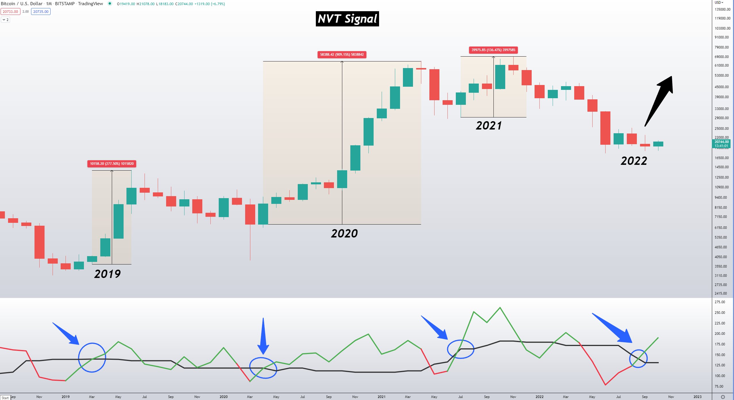 “When NVT signal crosses NVT ratio and the NVT signal was before, the price of $BTC has increased ~450% on average in the last 3 years. I expect that we will see a big green candle very soon.”