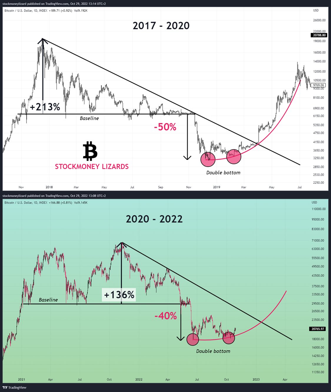 As such, the June trip to $17,600 and the lows from the first half of October this year may in fact have been a “double bottom” similar to Q4, 2018 and the first half of 2019.