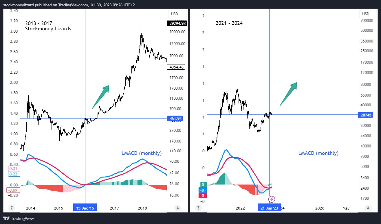 An accompanying chart showed a prior monthly MACD cross from late 2015 heralding preparations for Bitcoin’s ascent to last cycle’s $20,000 all-time high two years later.