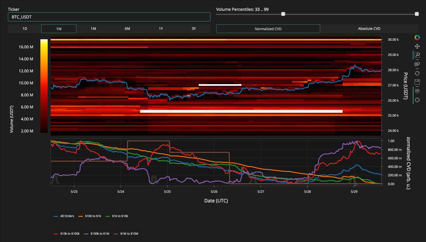 An accompanying chart showed the Binance BTC/USD order book, with increasing bid liquidity entering at $27,000.