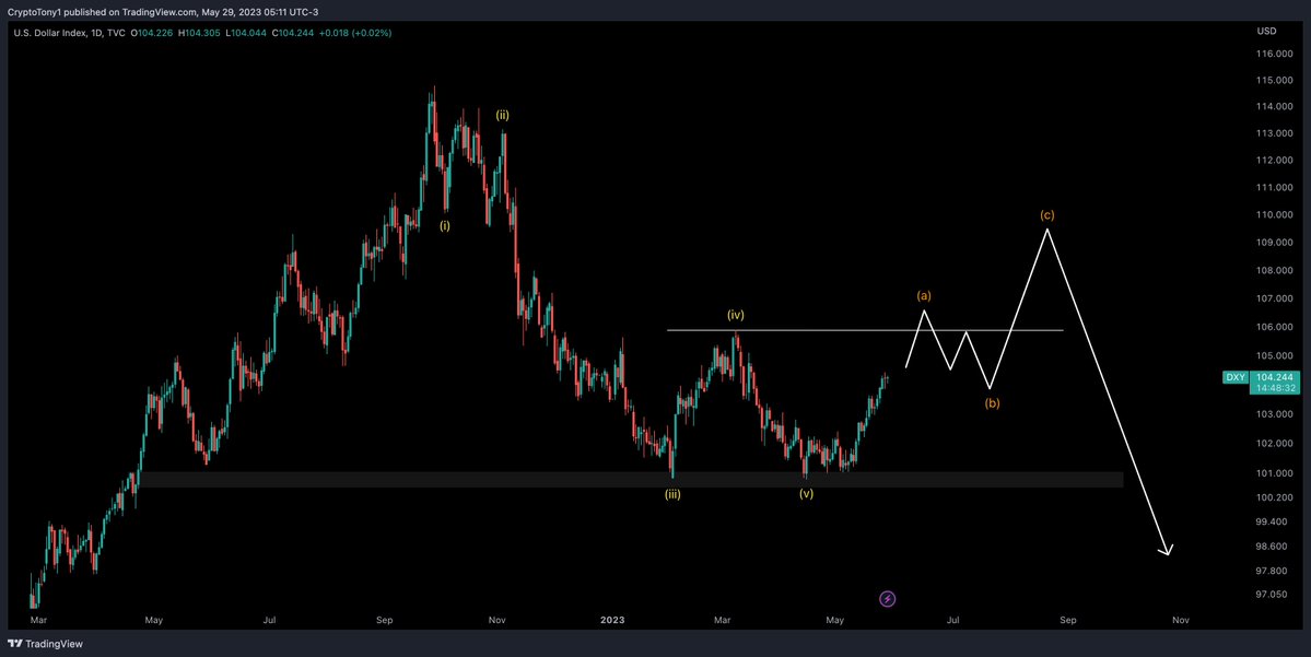 “My area of resistance i expect us to reject from is coming up at $105.80. Over the next few months though i do expect a strong dollar, but to roll over into next year.”