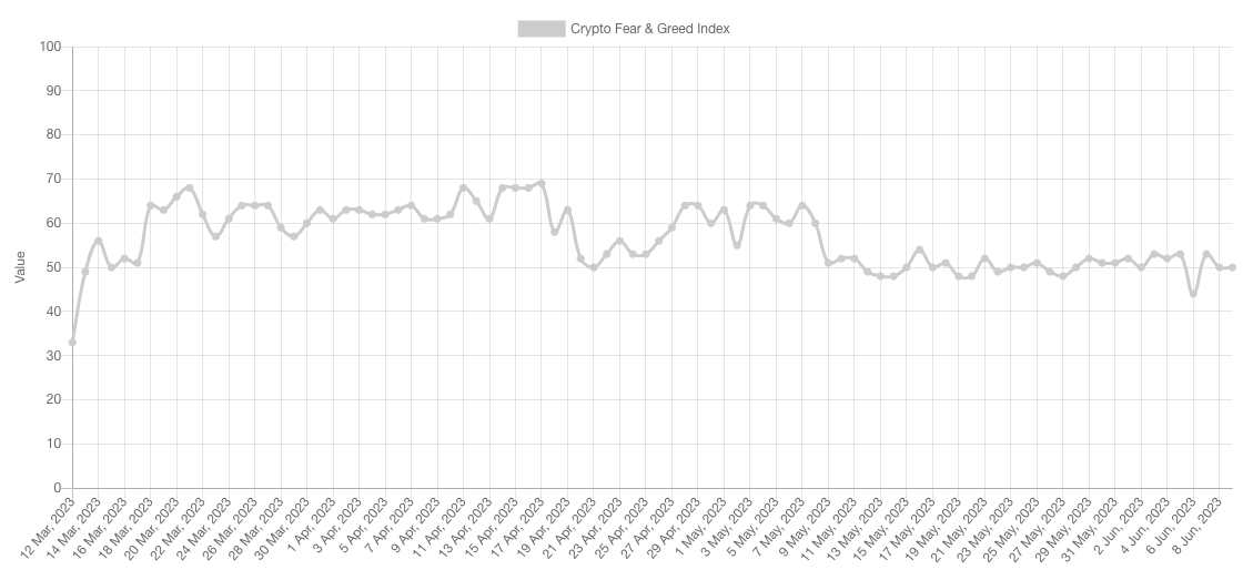 The days following the exchange lawsuits have so far seen crypto market sentiment withstand the pressure, with the Crypto Fear & Greed Index staying rooted at 50/100 — “neutral” territory.