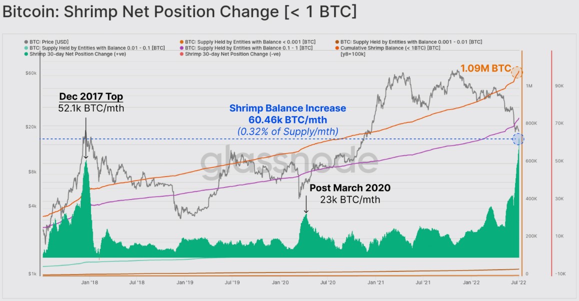 These so-called “shrimp” wallets have been eagerly scooping up low-priced Bitcoin to the tune of 60,460 BTC per month according to Glassnode, which is “the most aggressive rate in history.”