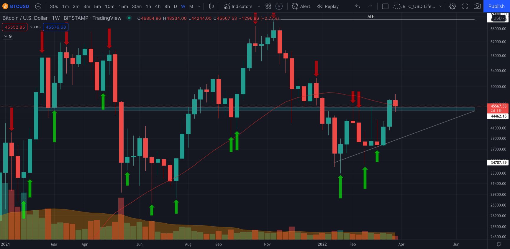 “BTC bulls lost the 50 WMA, but managed to reclaim the R/S flip above the structure. Volatility resides on either side of the range. Watching for the restests.”