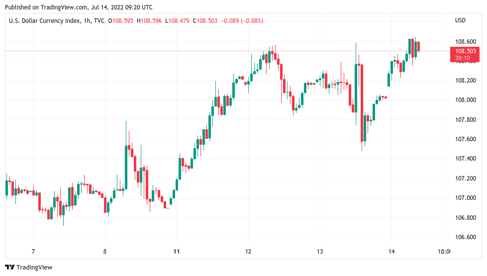 The new peak measured 108.64, an increase of over 1% versus the 24-hour lows.