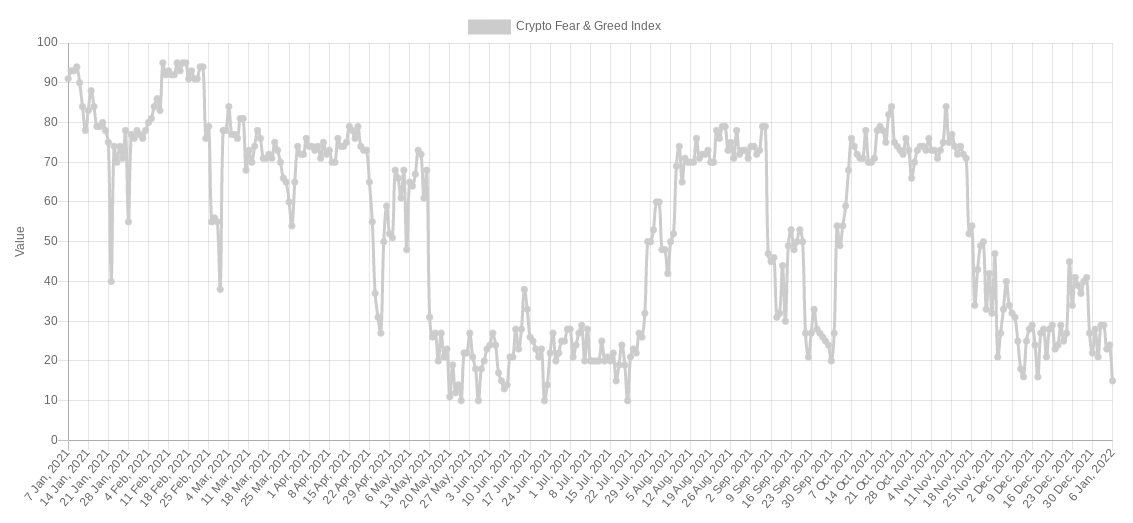 The Crypto Fear & Greed Index halved during the dip to 15/100 — deep within the Index’s “extreme fear” zone and its lowest level since last July.