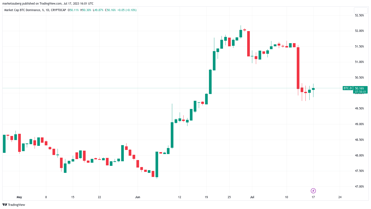 $BTC.D losing 50% Dominance Support. That’s not good for $BTC. Let’s see what happen next. https://t.co/xRiQfjTnKT pic.twitter.com/eLr2CglpD6