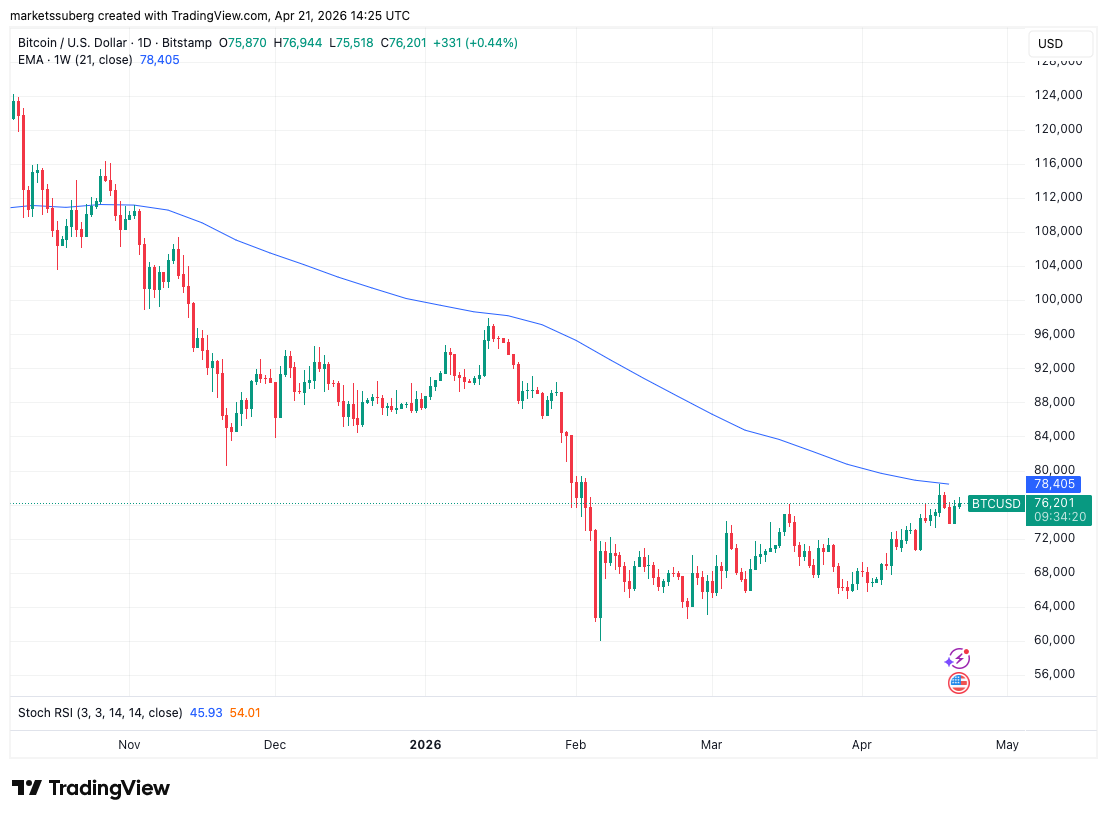 Bitcoin bulls still need to clear the nearby 21-week trend line keeping price pinned since October 2025.