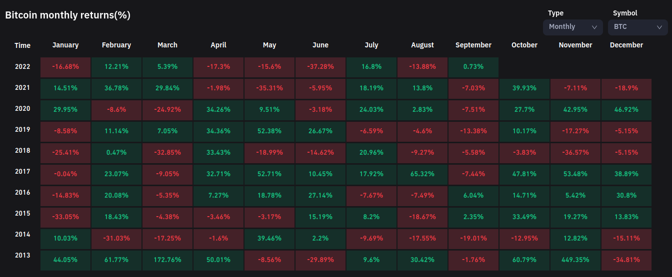 While modest, Bitcoin’s September gains totaled 0.7% at the time of writing, with BTC/USD at $20,200. If the month ends up “green,” it would be the first non-loss making September since 2016, data from Coinglass shows.