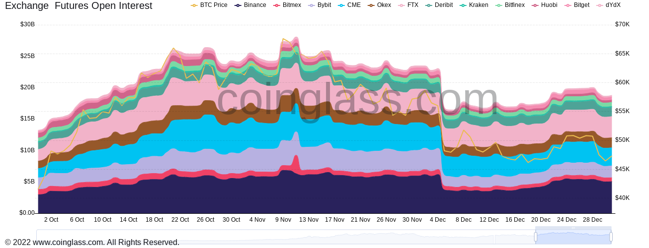 “Quieter trading activity is typical towards years end, however on a 7-day average basis, futures market volumes have seen a YTD decline of 16%. Thinner volume, and rising open interest (in a concentrated exchange) is a combination that can be favourable to at least a localised leverage squeeze over the coming weeks.”