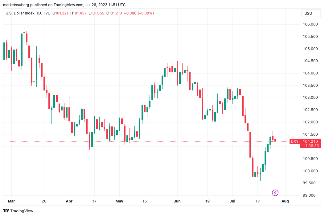 The U.S. dollar index, currently in the midst of a modest rebound after hitting its lowest in over a year, trended downhill once more on the day, nearing 101.