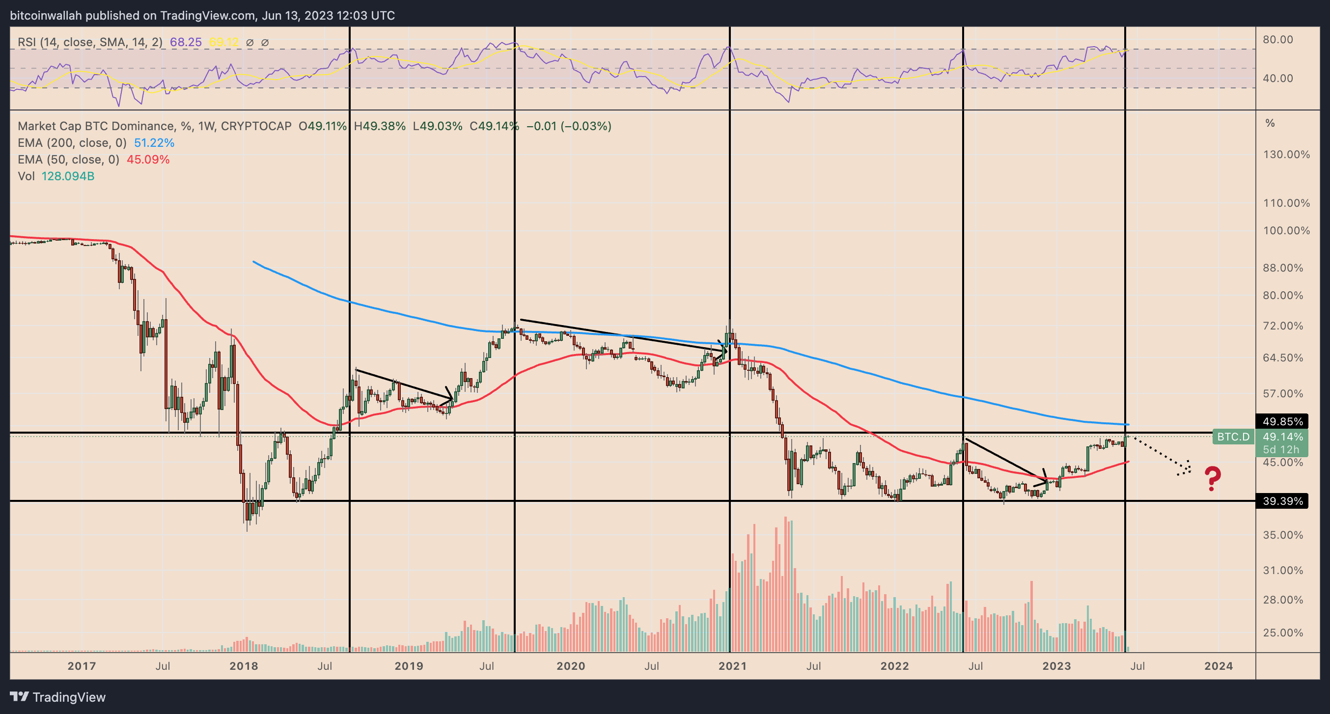 Therefore, if history repeats, Bitcoin’s dominance will decline toward 39% by late 2023 or early 2024.