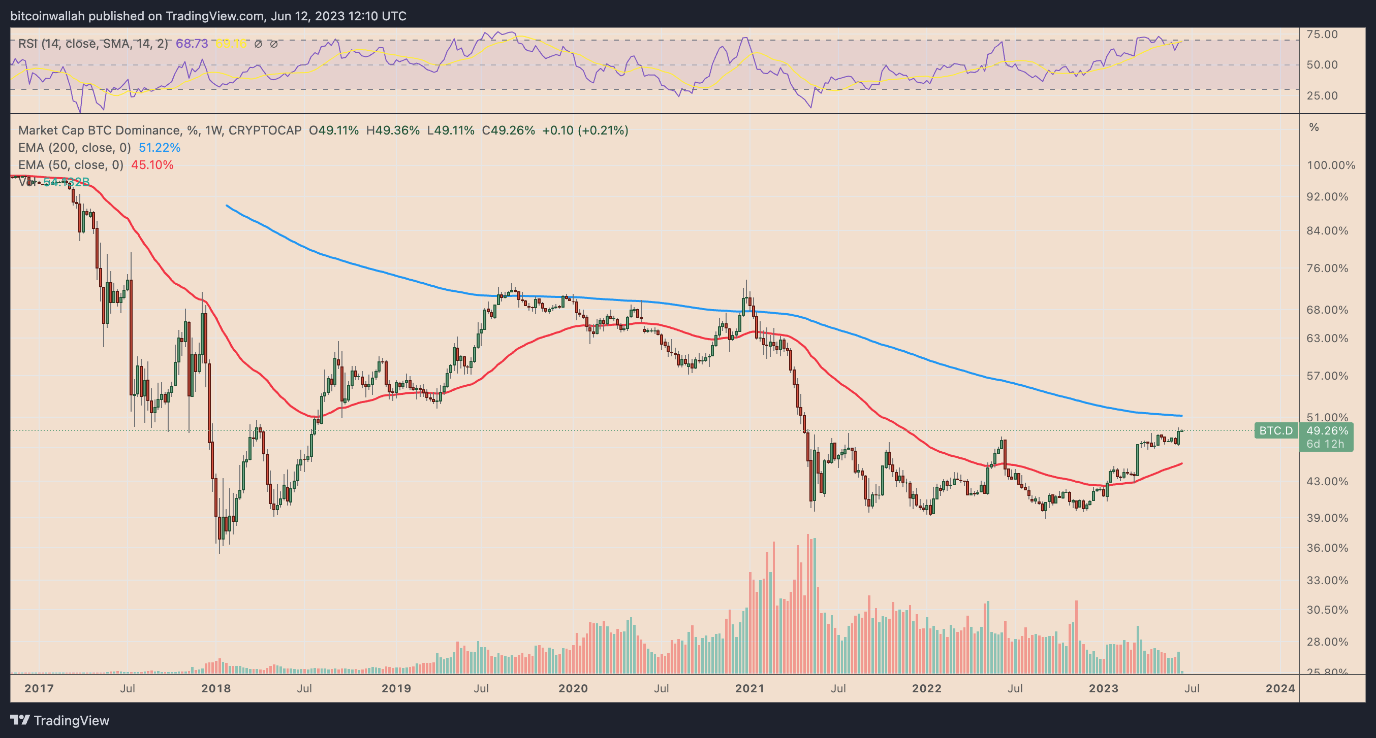 On June 13, the Bitcoin Dominance Index (BTC.D), which tracks BTC’s weight against other cryptocurrencies, reached 49.29%, slightly down from its two-year highs of 49.66% seen earlier this week.