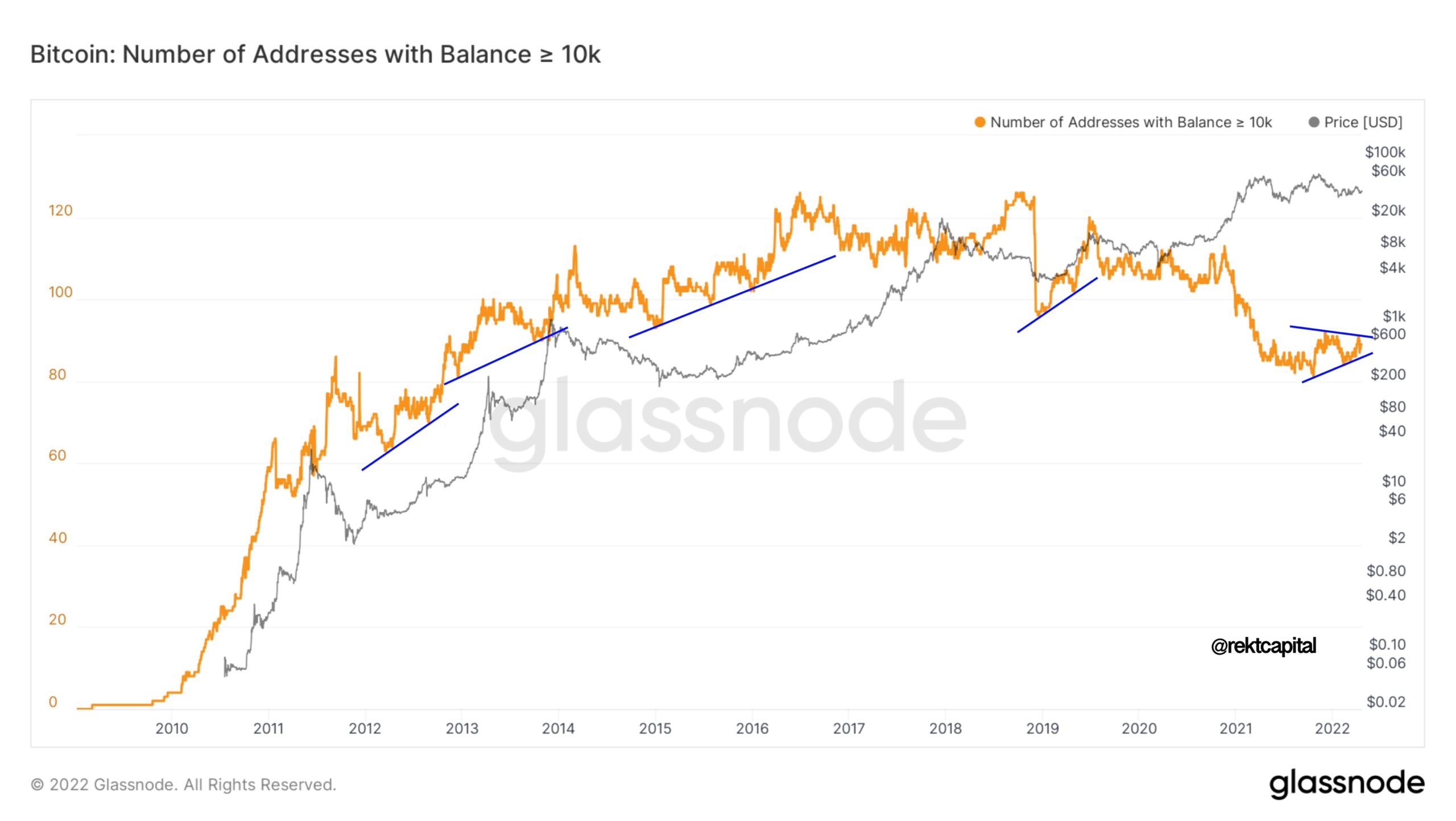 “Number of unique addresses holding min. 10K BTC has been increasing since Feb ’21,” he commented alongside data from on-chain analytics firm Glassnode.