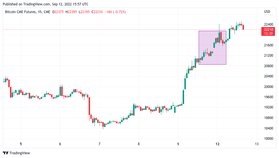 A CME Bitcoin futures gap left over from the Sep. 10 close meanwhile added the area around $21,400 as a possible retracement target.