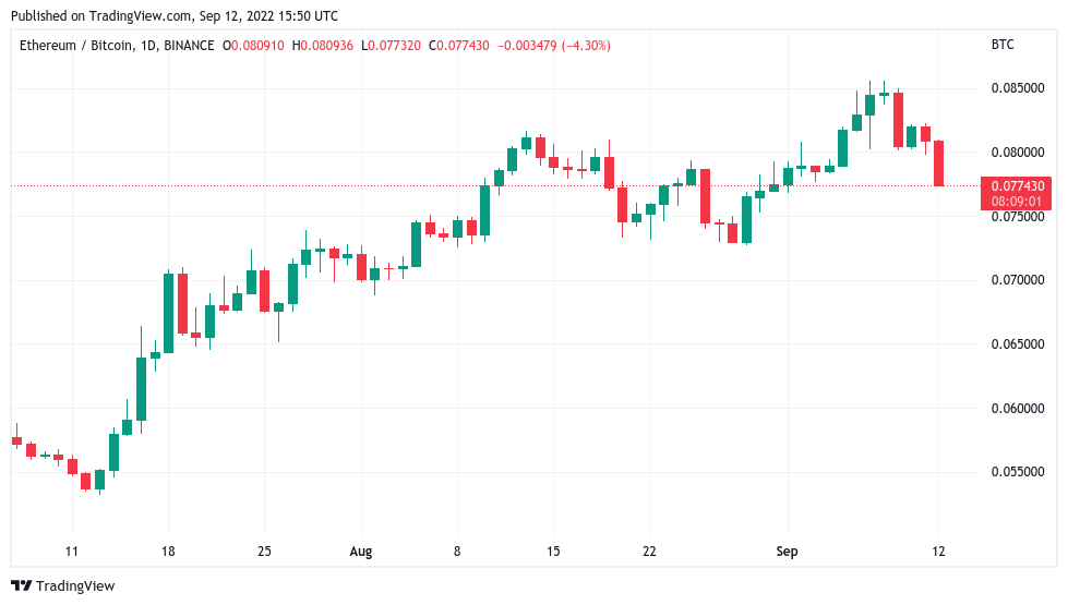 Less inspiring, meanwhile, was price action on Ethereum (ETH), which lost ground on the day despite ongoing hype around the Merge.