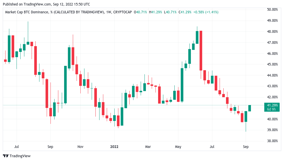 Bitcoin’s share of the overall cryptocurrency market cap thus saw a stiff rebound on the day after hitting just 38.9%, its lowest since January.