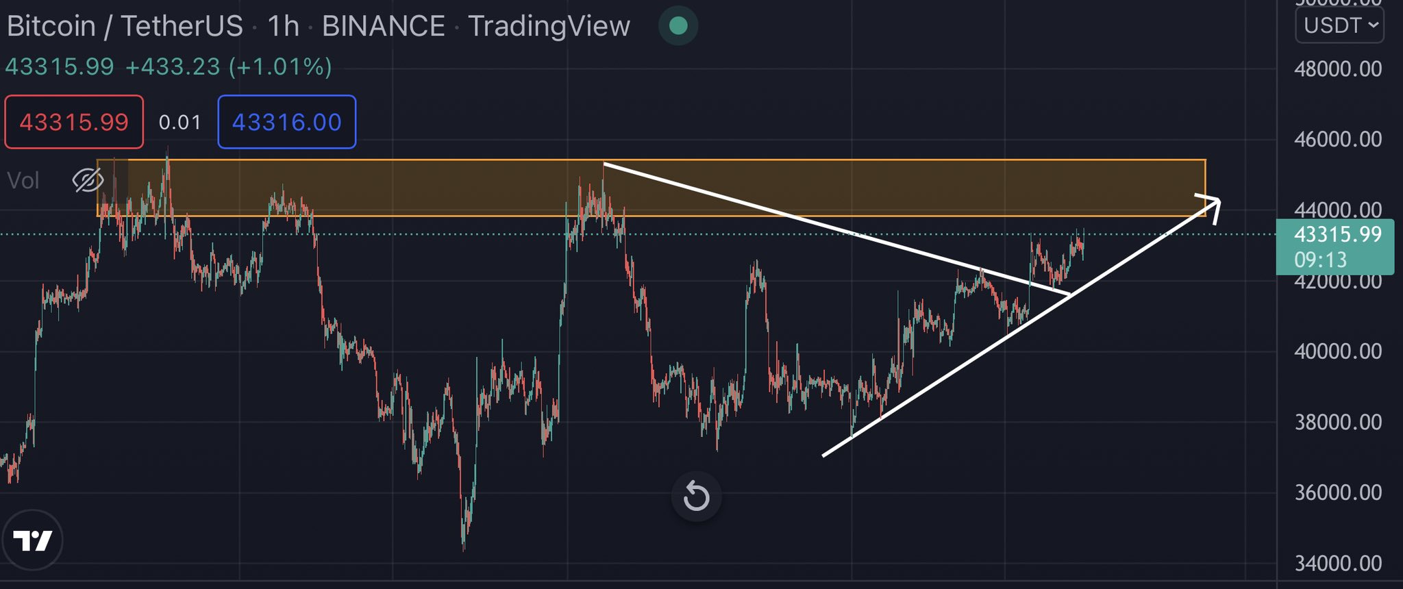 “$44,000-$46,000 is a very important zone for bulls to break. I expect a short-term pullback in this zone but a break of this zone in the next few days. Market definitely showing good strength.”