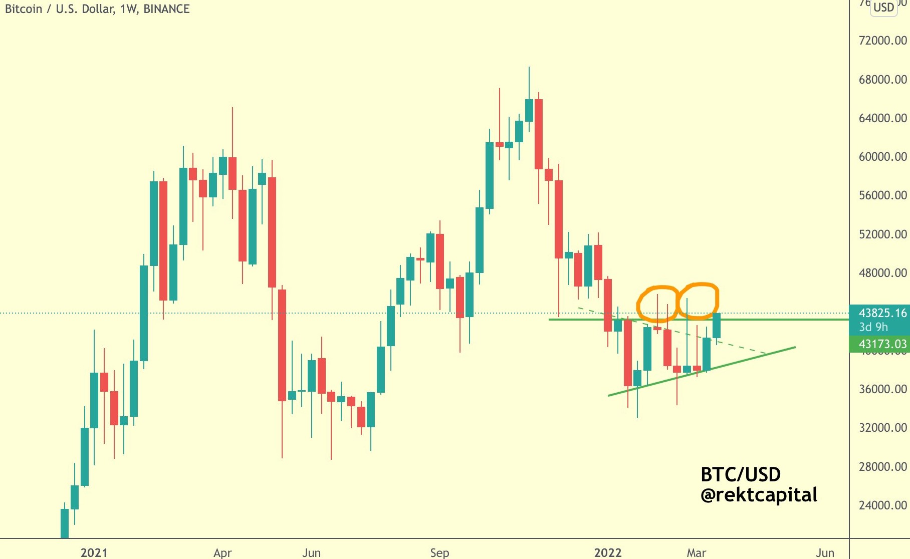 While the quick move up has many proclaiming a return of bull market conditions, Rekt Capital warned that “for BTC to confirm this breakout,” it “needs to flip the ascending triangle top into support (e.g. via a 1-week close).”