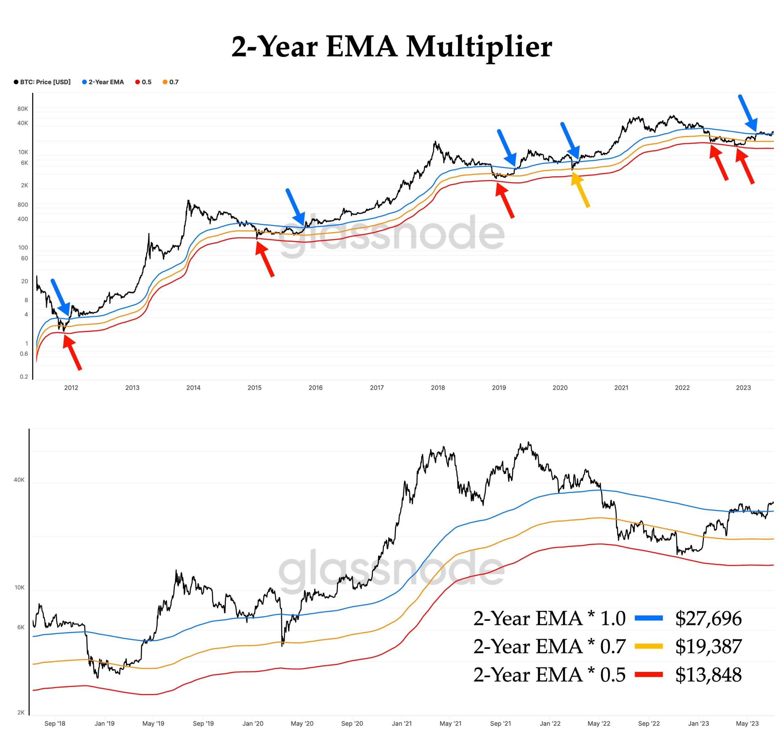 An accompanying chart showed the so-called 2-Year EMA Multiplier, depecting BTC price behavior around its trend lines in years past.