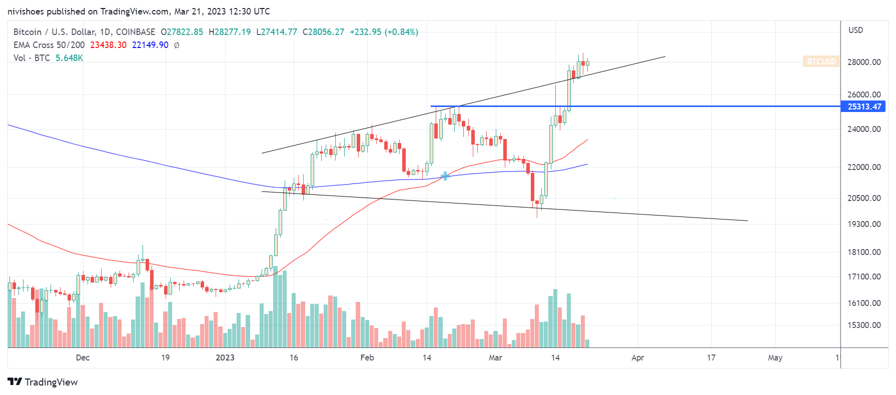 Technically, the BTC/USD pair appears strong on a daily time frame with a positive breakout and consolidation above its broadening wedge pattern. Currently, buyers are facing resistance from the June 2022 breakdown levels between $28,000 and $30,000.