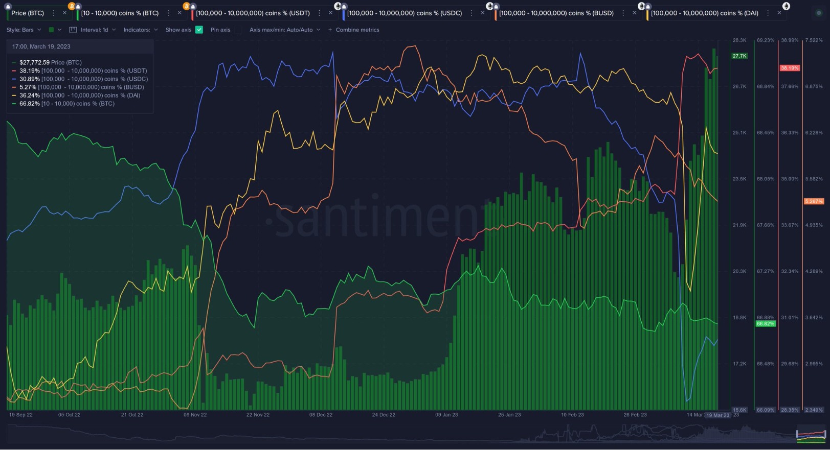 Additionally, the recent incident with USDC de-pegging and regulatory crackdown of BUSD stablecoin has likely caused a minor whale exodus from stablecoins. Santiment reported that “addresses holding between $100,000 to $10 million in stablecoins have been dropping slightly, but not to a notably high degree.”