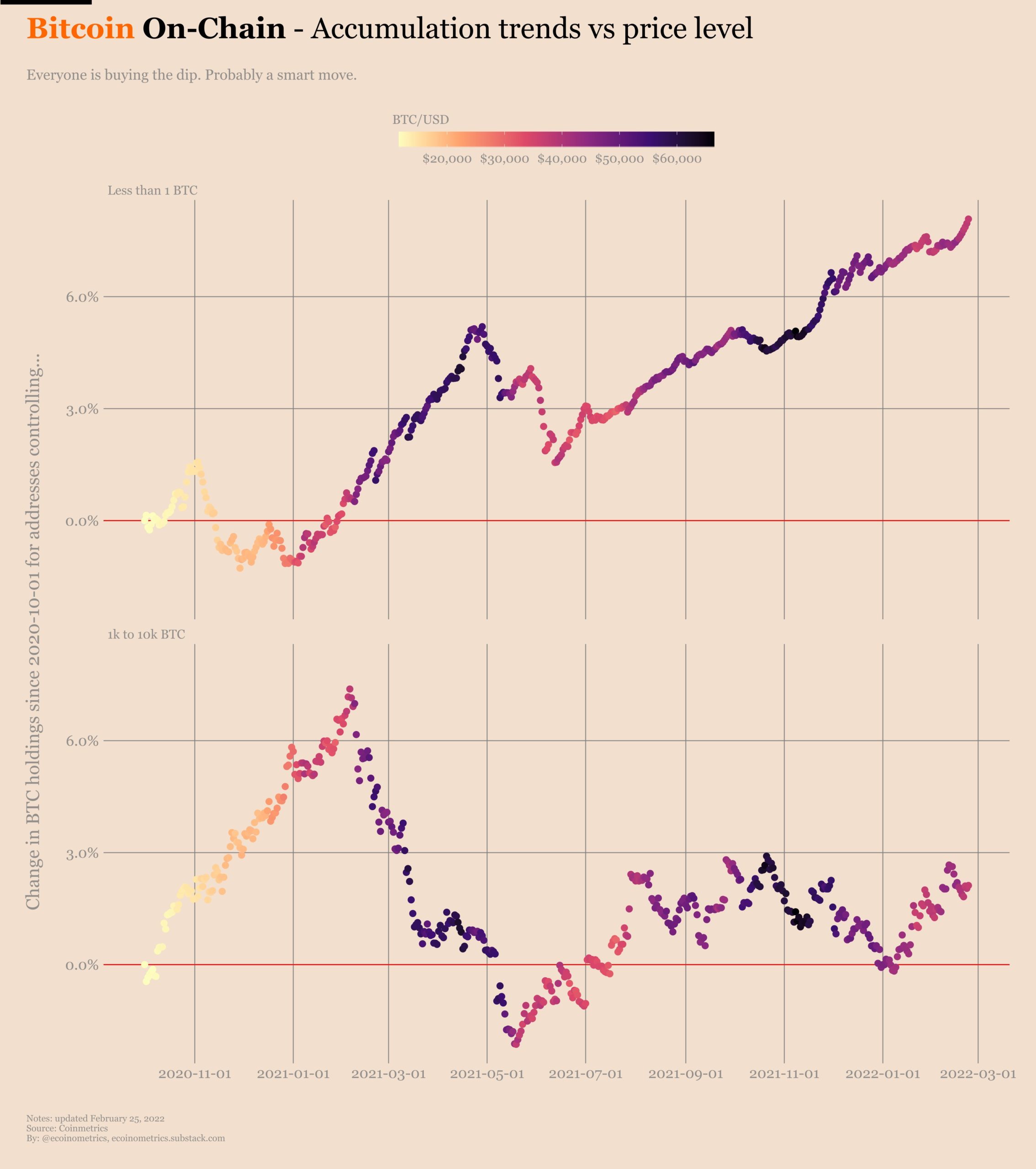 Data resource Ecoinometrics divided the addresses into two groups — one that holds less than 1 BTC and the other that holds anywhere between 1,000 BTC and 10,000 BTC — noting that both groups have been “buying the Bitcoin dip” and saying:
